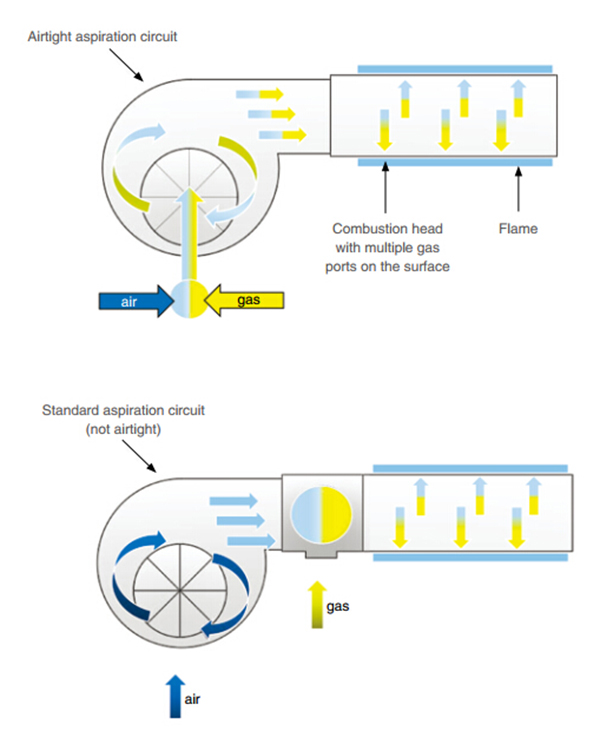 全预混燃烧,属于表面燃烧。燃气与空气,在进入燃烧头之前经过先混合圪匀。全预混燃烧。火焰只在燃烧器表面产生,火焰实际尺寸与燃烧头尺寸相同。因此,全预混燃烧器,不需要较大的炉膛尺寸,在很小的炉膛内依然能够实现完全的燃烧。